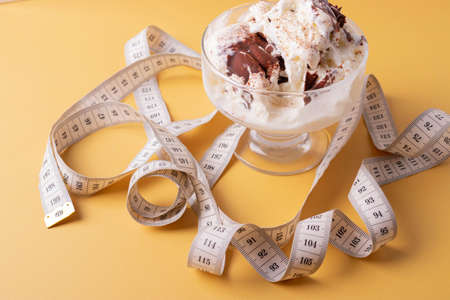 Concept of overweight and weight control. Unhealthy food. Chocolate glazed donut with sprinkles and a measuring tape, metric rules close-up on a bright yellow background. Flat lay, top view.