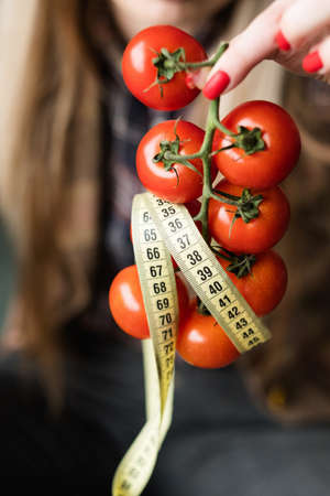 healthy food diet snacks. balanced nutrition and vegetarian lifestyle. woman holding fresh tomatoes with twisted measuring tape in hand.
