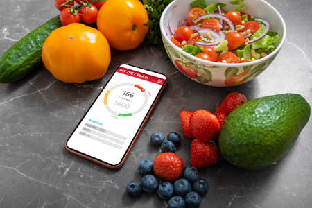 Smartphone with healthy meal planning app on a kitchen counter surrounded by vegetables and fruits