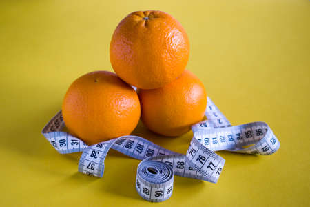 Three oranges on yellow background with tape measure