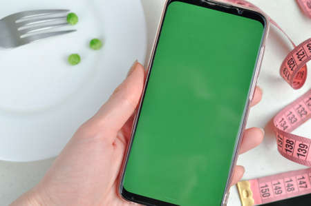 Smartphone with green screen and fresh vegetables copy space. High quality photo