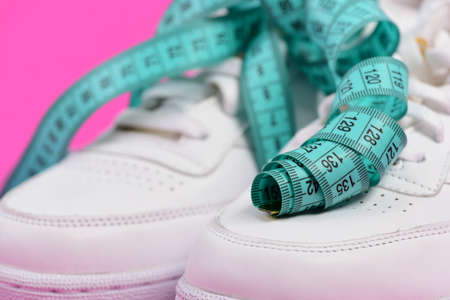 Sneakers with measuring tape on cyan background