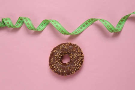 Close up of donut and measuring tape, weight loss and diet concept.