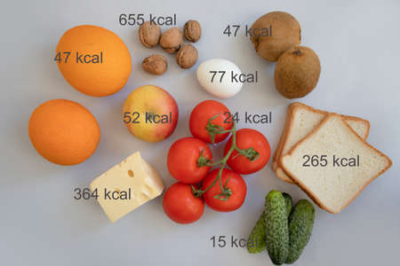 different food, vegetables and fruits with calorie indication