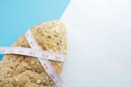 slice of whole meal bread and measurement tape on table .