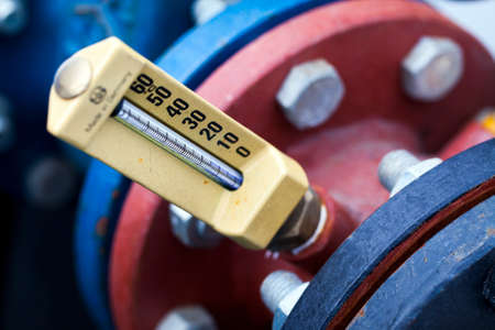 the thermometer shows the temperature in degrees and is installed on industrial equipment