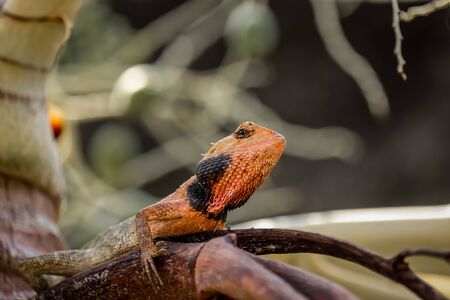 Oriental garden lizard (Calotes versicolor) - Garden lizards are relaxing on tree branches, camouflage garden lizards. Close up chameleon details.