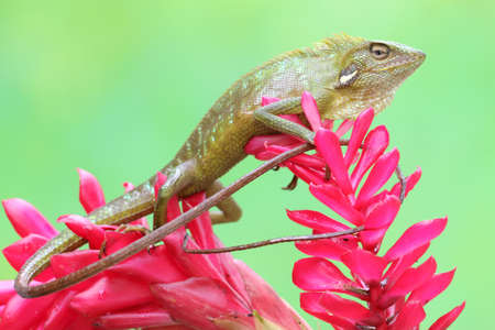 Oriental garden lizard on Red Euphorbia Beautiful Flower in Thailand