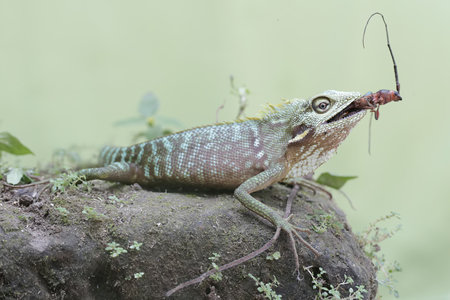 A green crested lizard (Bronchocela jubata) is sunbathing before starting its daily activities.