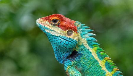 A striking close-up of a chameleon lizard showcasing its vibrant colors, including a red head and bright blue neck, set against a blurred green background.
