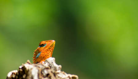Close-up of an isolated orange and green lizard on a tree. Ella, Sri Lanka. beautiful green bokeh with light in the background