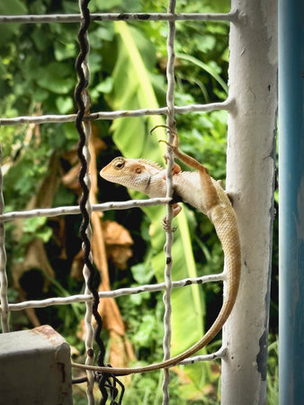 A garden lizard with plain face uses long fingers and nails to cling to a mesh wall. Reptile species with a long tail.