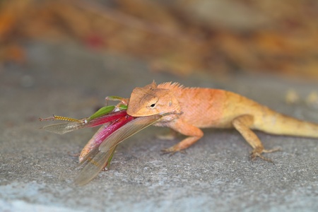 Brown headed lizard chameleon in Thailand, Asia, looking into lens. Red headed Lizard. Vertical photograph
