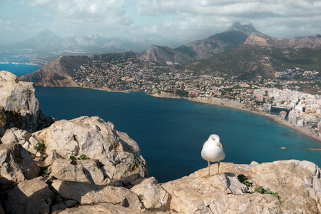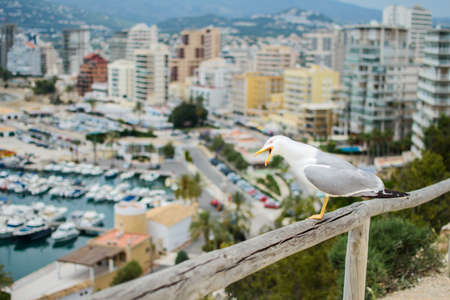 Seagull sitting on a wooden pole, on the background of the beautiful city of Calpe on the Costa Blanca, Spain.