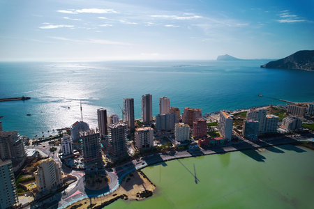 Aerial shot of Calpe cityscape. Costa Blanca, Spain. Coastal town with towering residential and commercial buildings lining salt lake and Mediterranean Sea shoreline. Travel and touristic places concept
