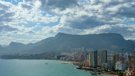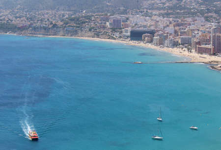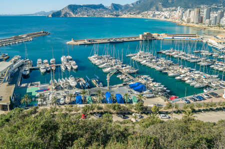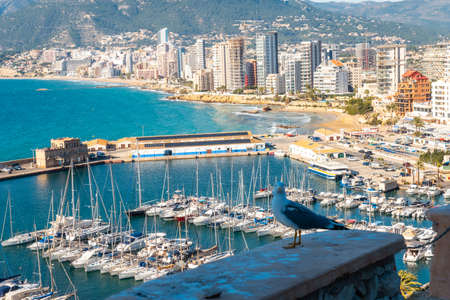 Coastline of the Mediterranean resort of Calpe, Spain with sea and yachts, lake, skyscrapers and mountain range
