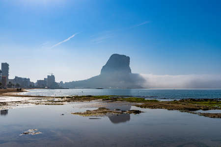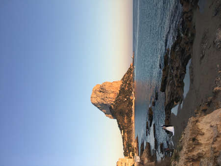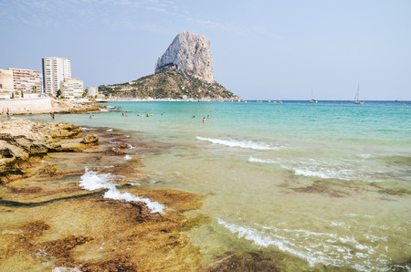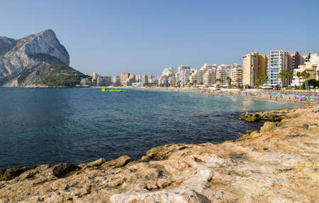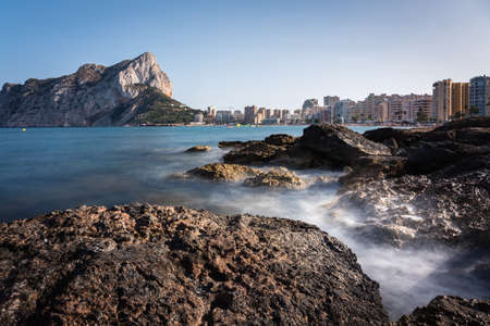 View from the rocks of the coastline with the urban beach of Calpe and the crag in the background, Alicante, Spain