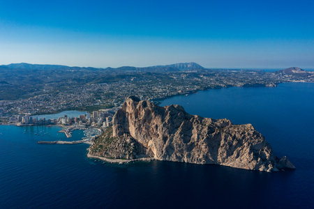 Drone point of view Rock of Penon de Ifach, harbor, Mediterranean sea rooftops of houses Calpe cityscape. Coastal town located in comarca of Marina Alta province of Alicante Valencian Community, Spain