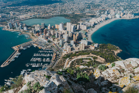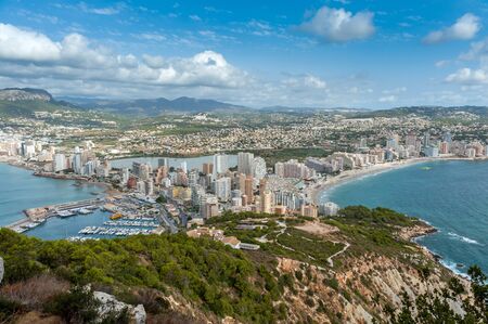 View over Calpe (Calp) town, Spain. Shot from the Penon ( Ifach) rock, overlooking the coast, the harbor and Sierra de Bernia mountains