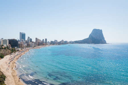Calpe town coastline aerial view panorama Costa Blanca coast with rock mountain Penon de Ifach, sandy beach, Calpe bay Mediterranean Sea with azure turquoise water in sunny summer day, Spain