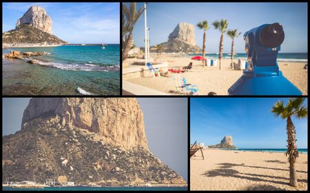 Collage of Calpe in Alicante Arenal Bol beach with Penon de Ifach mountain in Mediterranean Sea of ??Spain.