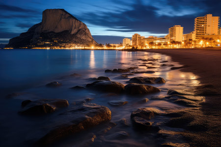 Panoramic view from above of Calpe cityscape. Street lights illuminating seafront promenade during sunset. Empty sandy beach and rocky mountain of Penon de Ifach. Costa Blanca Alicante province, Spain