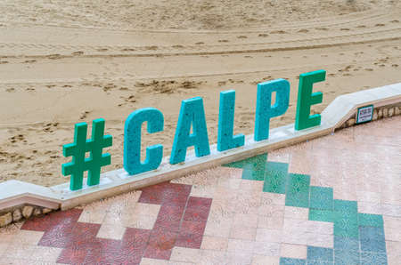 CALPE, SPAIN - JANUARY 23, 2022: Sign in Calpe with the name of the city, with the beach in the background, Alicante province, Valencian Community, Spain