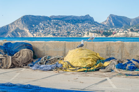 CALPE, SPAIN - JANUARY 26, 2022: View of the fishing port of Calpe, with the Peñon de Ifach in the background, Alicante province, Valencian Community, Spain