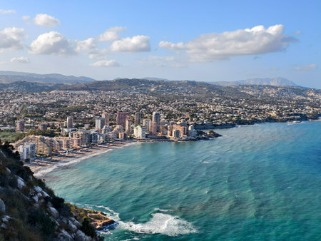 Aerial view of Calpe's coastline with turquoise waters and sandy beaches, Comunidad Autonoma de Valencia