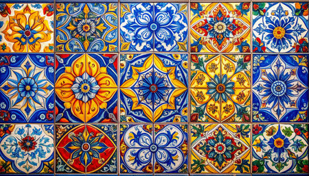 This image showcases an array of colorful hand-painted decorative tiles arranged in a stunning mosaic pattern, perfect for enhancing artistic and cultural design themes.