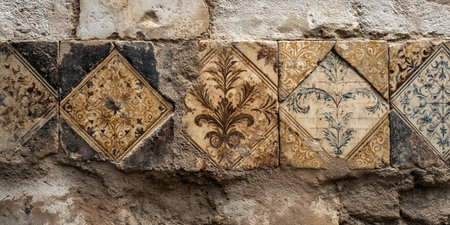 Wall of old, ornate tiles with peeling paint, showing patterns in various stages of weathering and decay.