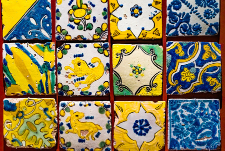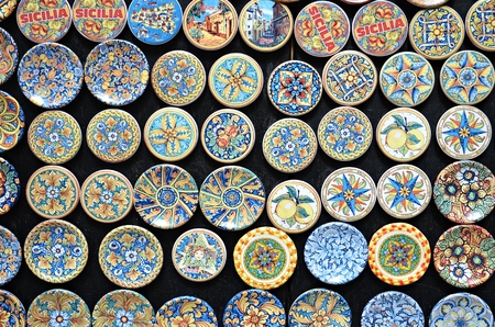 close up of typical colorful sicilian pottery little ceramic plates with local motives