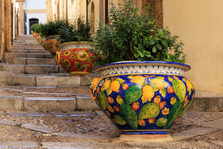 Colorful ceramic pots on a historic staircase in Cefalu, Sicily