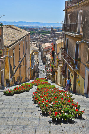 Flowers on the steps of the church of Saint Mary in Caltagirone, old town in Sicily.