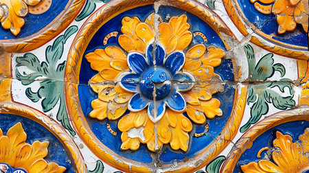 Traditional spanish tile showcasing intricate blue and yellow floral patterns with aged textures