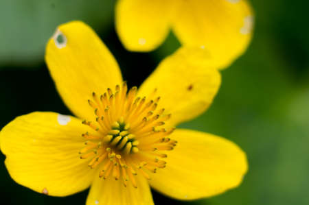 Closeup of a bright yellow marsh marigold flower, Caltha palustris