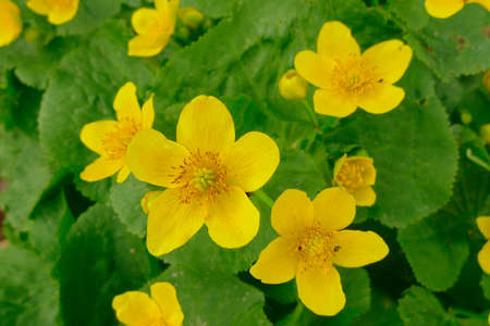 caltha palustris, marsh-marigold, kingcup yellow flowers on sunny day