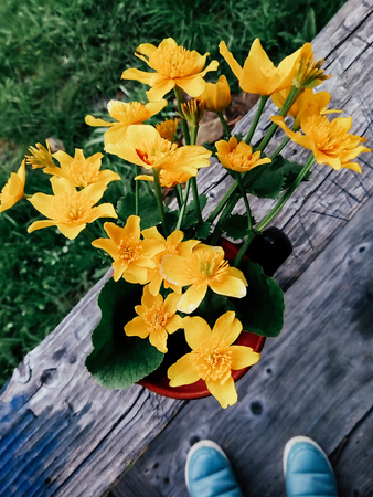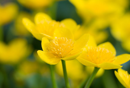 Yellow flowers of marsh marigold. Nature. Delicate natural floral background.
