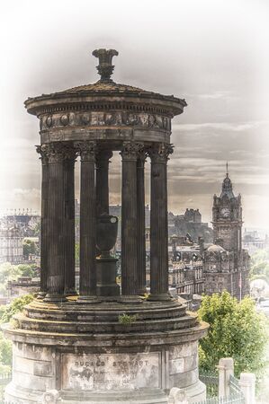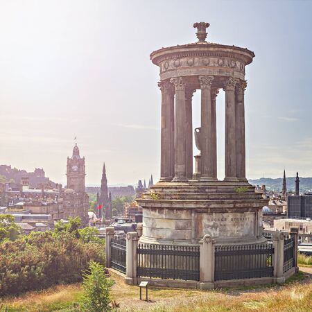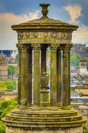 EDINBURGH, SCOTLAND - JULY 30, 2019: The memorial of Dugald Stewart on the Calton hill with a view at Edinburgh cityscape with the Balmoral, the castle and The Hub
