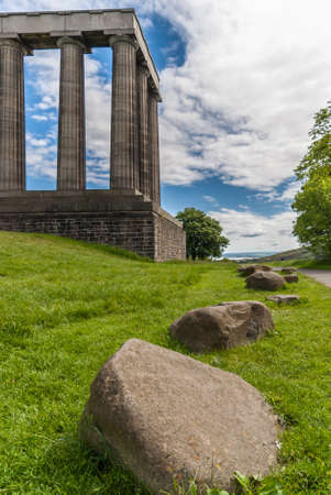 Edinburgh, Scotland, UK - June 13, 2012: Corner of National Monument is series of brown pilars against blue sky with white clouds. Boulders up front in green grass.
