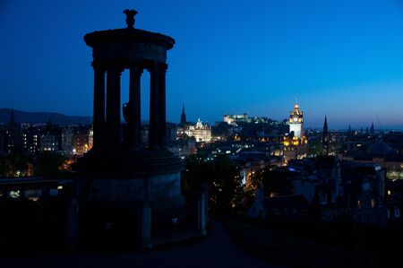 Cityscape of the monument to Dugald Stewart and the evening of Edinburgh, Scotland, United Kingdom