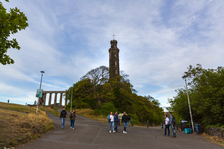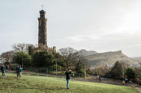 Edinburgh, Scotland - December 30, 2016: People are visiting the Calton Hill and taking photographs near the Nelson Monument in Edinburgh, Scotland, UK