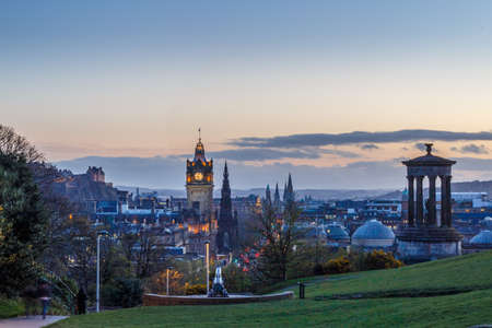Edinburgh Cityscape from Calton Hill sunset, Edinburgh, Scotland UK