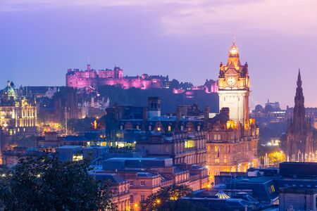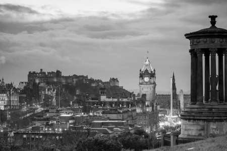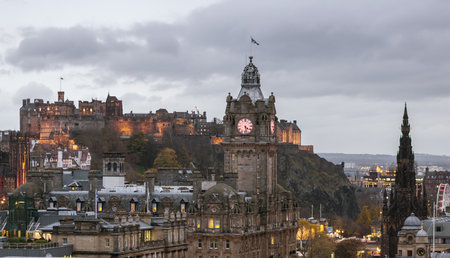 View from Calton Hill of the Balmoral Hotel with Scotts Monument to the right and Edinburgh Castle illuminated in background on a cloudy day