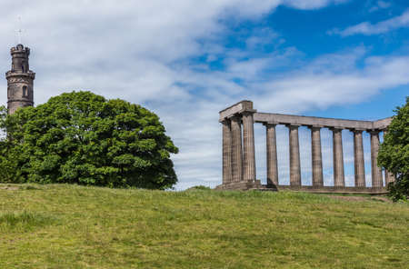 Edinburgh, Scotland, UK - June 13, 2012: Nelson and National Monuments on Calton Hill captured between green trees behind green lawn and under blue cloudy sky.