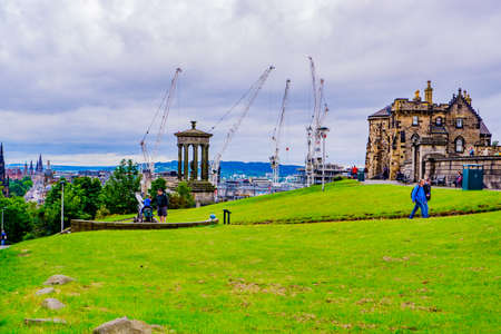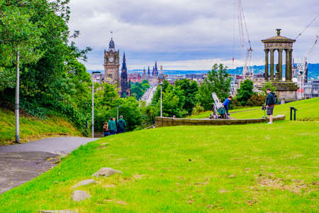 EDINBURGH - AUG. 30, 2017: Calton Hill in the Old City of Edinburgh, Scotland, and views of the city skyline from the Hill