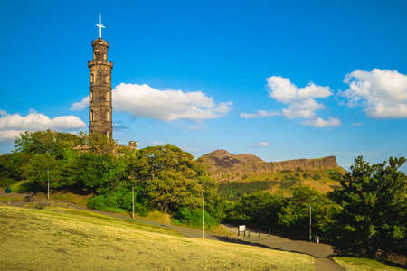 nelson monument at calton hill and arthur seat in edinburgh, scotland, uk