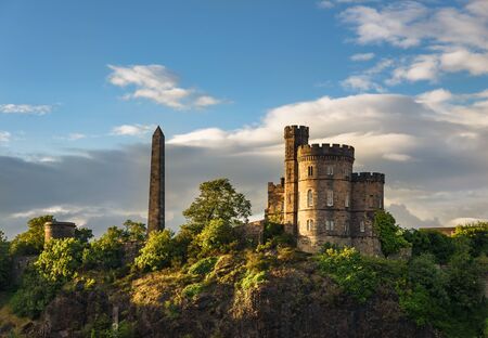Calton Hill with the City Observatory and Playfair Monument. Edinburgh, Scotland