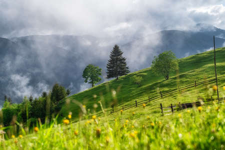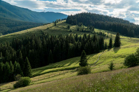 Beautiful landscape with spruce forest, fog, hills and green grass in the Carpathian Mountains, Transylvania, Romania.