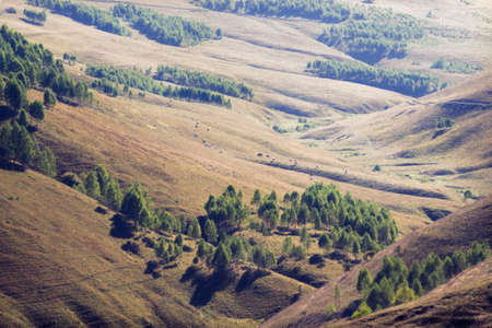 Autumn background in the mountains. Hills covered with yellow trees and houses